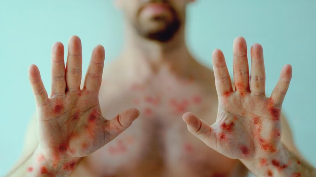 • Lesiones en la piel que pueden inicialmente ser planas o ligeramente elevadas (como ampollas) que se llenan de líquido transparente o amarillento y después forman costra. La erupción en la piel se puede presentar en plantas de manos y pies, cara, bocas y ojos, incluso en área genital y perianal.