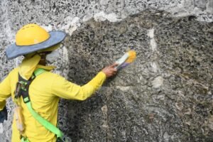Utilizando cepillos de cerdas plásticas, se inicia la actividad con una limpieza en seco, luego se humedece la superficie con una solución de agua y jabón neutro mientras se continúa el cepillado, y se finaliza enjuagando el muro con la aplicación de agua limpia, garantizando un procedimiento poco abrasivo.