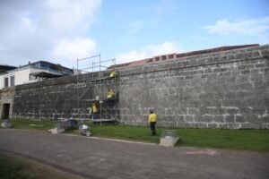 Egresados de la Escuela Taller Cartagena de Indias (Etcar), con la guía de un maestro experimentado y la supervisión de arquitectos restauradores, avanza en la limpieza de la escarpa (superficie muraria) entre los baluartes de San Lucas y de San Pedro Mártir, en el barrio San Diego del Centro Histórico, en cumplimiento del Plan Anual de Mantenimiento de las Fortificaciones planteado por la institución.