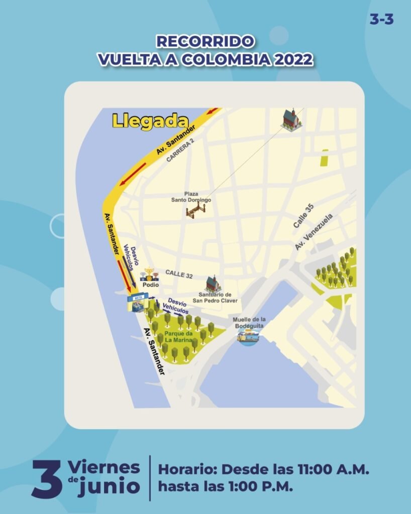 En la medida en la que los ciclistas se acerquen a la meta de la competencia en Cartagena, será cerrada la calzada de la Avenida Santander, sentido entrada a Bocagrande – Las Tenazas.