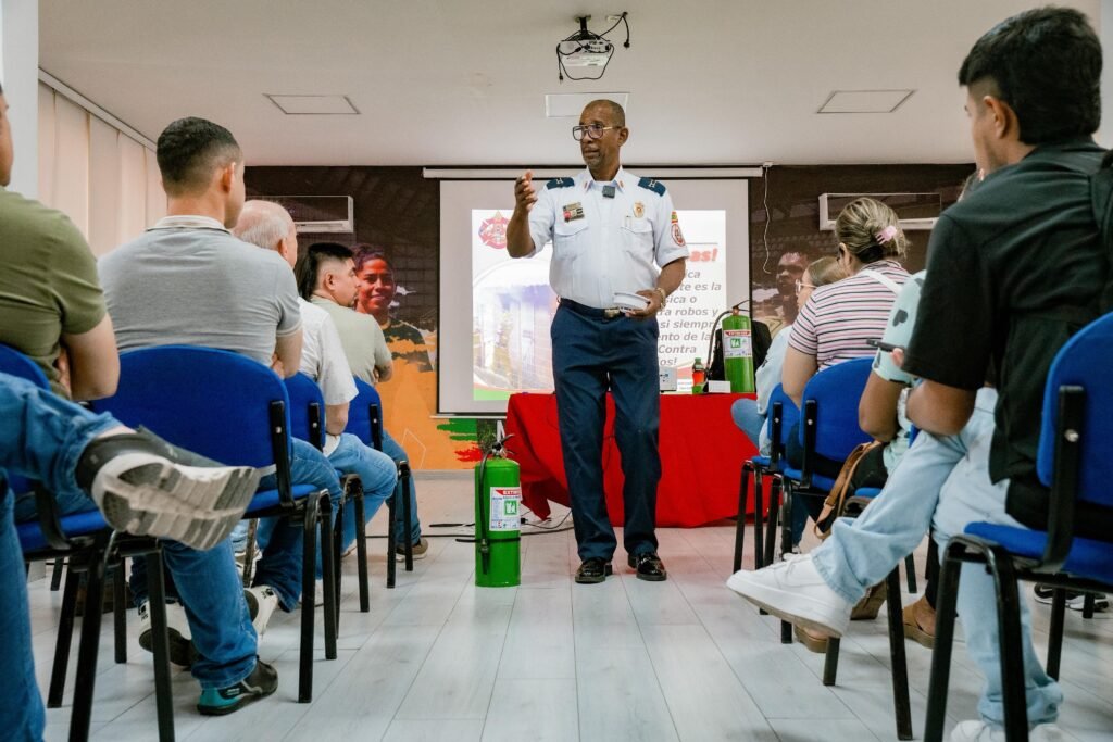 La capacitación fue liderada por el teniente Franklin Hamilton Velásquez, quien orientó a los asistentes sobre la normativa actual en seguridad contra incendios, el uso adecuado de extintores, el manejo seguro de conexiones eléctricas y las acciones clave para actuar de manera oportuna ante una emergencia.