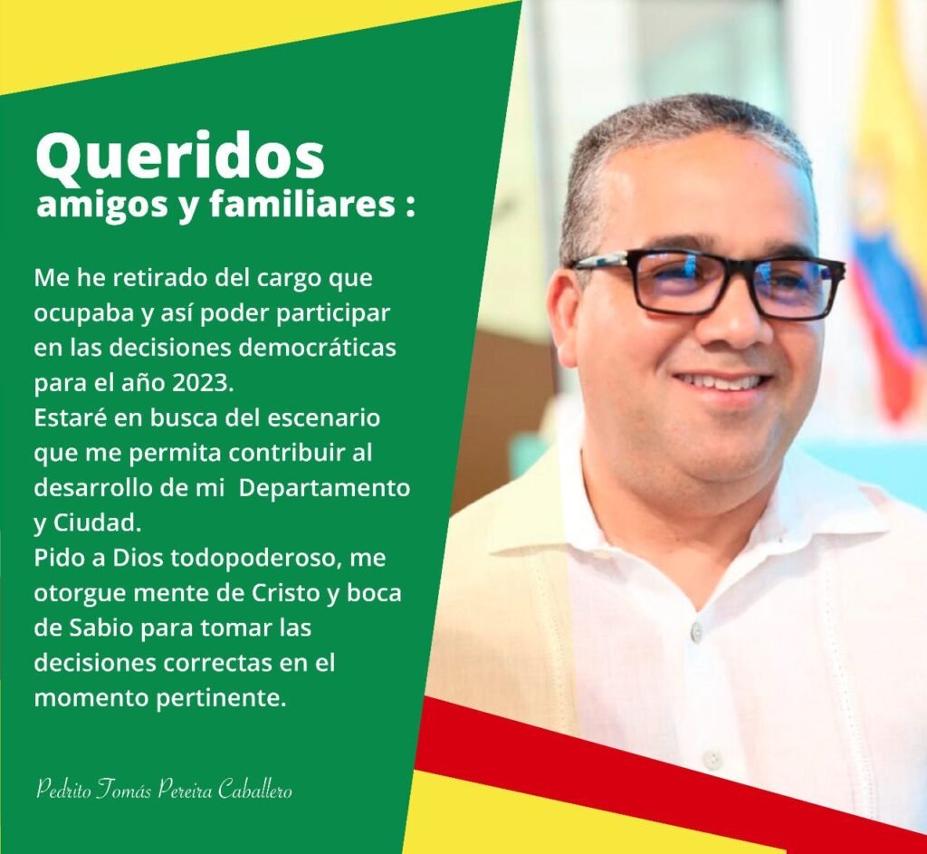 El ex alcalde y ex congresista, Pedrito Pereira Caballero, quien dejó un alto cargo en la Contraloría General de la República, anunció que aspirará a un cargo de elección popular en el 2023. Es
