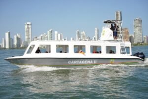 La embarcación Cartagena 1, es un bote más rápido, deportivo y de alto desempeño, pensado para operaciones ágiles y traslados oportunos del equipo de trabajo y para autoridades policiales y marítimas cuando la ciudad lo requiera. Tiene una eslora de 12,47 metros, tres motores Mercury de 300 HP, capacidad para 16 pasajeros, baño integrado, consola central y mobiliario de alto confort.